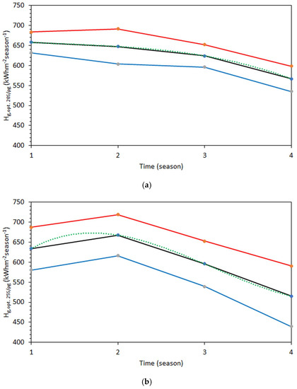 Seasonal solar energy sums were also calculated. They were averaged over all sites in the same SEZ as well over all sites (all SEZs) as in the case of the annual and monthly sums, under all-sky conditions. For every case, regression curves that best fit the mean values were estimated with greatest accuracy (R2 = 1). Maximum sums were found in the summer (730 kWm−2), and minimum ones in the winter (450 kWm−2), as expected.