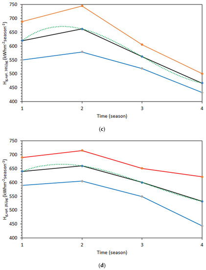Investors in solar energy installations are mostly interested in knowing the minimum and maximum possible energy received by their energy systems. This is interpreted as the solar potential during the winter and summer months. Therefore, this Section is devoted to analysing the solar energy totals during all seasons, i.e., spring (March-April-May), summer (June-July-August), autumn (September-October-November) and winter (December-January-February).