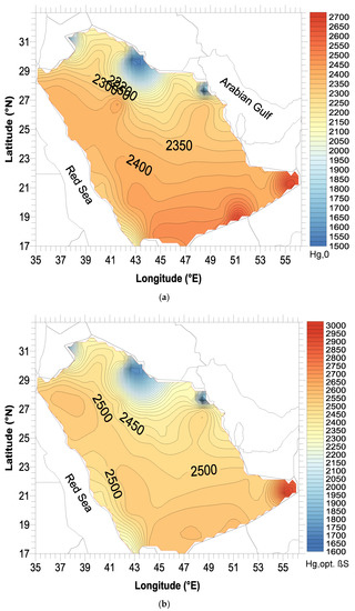 Figure 7 shows the solar potential over Saudi Arabia in terms of annual Hg,0 and Hg,opt. βS/ρg sums. It is interesting to observe a gradual increase in the annual solar potential in the direction NE–SW for both horizontal and optimally inclined flat planes. Very similar results to the present study are given in the Solar Radiation Atlas for Saudi Arabia [45]. This gradient is due to two reasons. (i) Latitude: the higher the latitude, the less solar radiation is received on the surface of the Earth. (ii) Meteorology: more frequent precipitation is observed in the north-eastern part of the country, which is related to the precipitation occurring in southern Iraq and Iran [46].