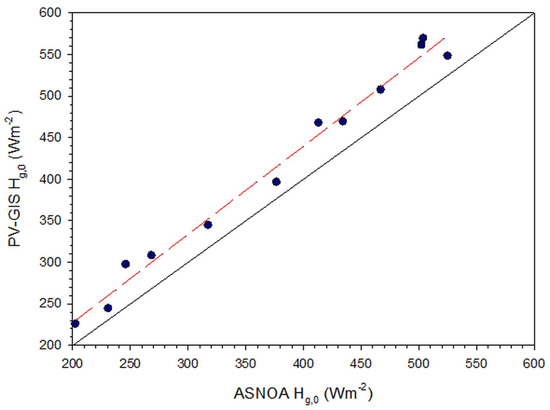 Given that all data used in this study were downloaded from the PV-GIS platform, the question arises as to the accuracy and reliability of these data. For this reason, various studies have presented validation results for the solar radiation PV-GIS-satellite-derived data by comparing them with ground-based solar radiation measurements from 30 BSRN stations [30,34,35]. The reported % differences in the form of “100*(PV-GIS-data—station-data)/station-data” were found to vary between −14% to +11%. To further demonstrate this, comparison of monthly mean Hg,0 values derived from solar radiation measurements continuously performed at the Actinometric Station of the National Observatory of Athens (ASNOA, 37.97° N, 23.72° E, 107 m above sea level) was made with respective values from the PV-GIS platform in the period 2005–2011. The ASNOA site was selected as Saudi Arabia does not possess any permanent solar radiation measuring network nor isolated measuring radiometric stations on a systematic basis. The only station that participated in many international networks (e.g., AERONET, BSRN) is the Solar Village one (18.23° N, 42.66° E, 2039 m above sea level) that was in operation during the period March 1998–December 2002, a period that does not include the starting date of PV-GIS (January 2005). Figure 8 shows this comparison. Although there is an excellent agreement qualitatively (R2 = 0.99), it seems that the PV-GIS-retrieved data overestimate the measured Hg,0 by a factor of 1.1; this ratio is defined by any Hg,0 value on the best-fit line to the corresponding one on the 1:1 line. In other words, the PV-GIS data are +10% higher than the ASNOA values, in accordance to the error range mentioned above. Nevertheless, as this factor is small and R2 is high, the PV-GIS data are considered acceptable for solar energy analyses.