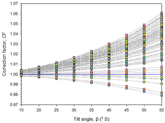 Variation of the correction factor, CF, as function of the tilt angle of the inclined flat plane, β, towards south (S), under all-sky conditions and averaged over the period 2005–2016. The blue straight line represents CF = 1; site #24 is very close to this value (0.98, Figure 10a). The dotted lines are the best-fit curves to the data points of each site. The best-fit lines are expressed by 3rd-order polynomials. For example, the upper best-fit curve is: CF = 2·10−7 β3 + 5·10−6 β2 + 1·10−4 β + 0.9977 (R2 = 1), while the lowest one: CF = −5·10−8 β3 − 2·10−6 β2 − 9·10−5 β + 1.0006 (R2 = 1). The blue horizontal line indicates CF = 1.