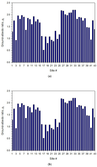 Annual mean ratios of ground albedo, ρr, for the 82 sites in Saudi Arabia; (a) sites 1–43, (b) sites 44–82, averaged over the period 2005–2016.