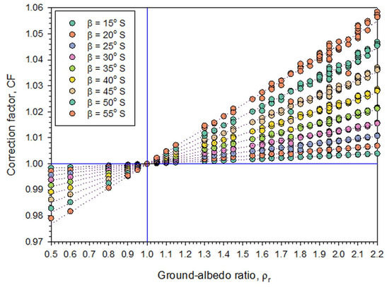 Variation of the correction factor, CF, as function of the ground-albedo ratio, ρr, for various tilt angles, β, for a flat plane in Saudi Arabia inclined towards south (S), averaged over the period 2005–2016. The blue lines correspond to ρr = 1 and CF =1.