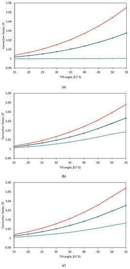 Regression equations for the best-fit curves to the correction-factor, CF, values averaged over all respective sites in the period 2005–2016, together with their R2 values; β is the optimum tilt angle of a flat surface inclined in a SEZ towards south (S).