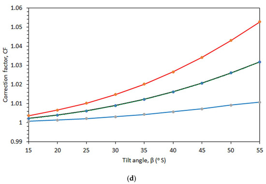 Variation of the correction factor, CF, as function of the tilt angle, β, of an inclined surface towards south (S) in (a) SEZ-A, (b) SEZ-B, (c) SEZ-C, and (d) all SEZs, averaged over the period 2005–2016. The black solid lines are the mean CF values, while the red and blue ones correspond to the mean + 1σ, and mean − 1σ, respectively. The green dotted lines are the best fits to the mean curves and are hardly seen as they coincide with the mean curves.