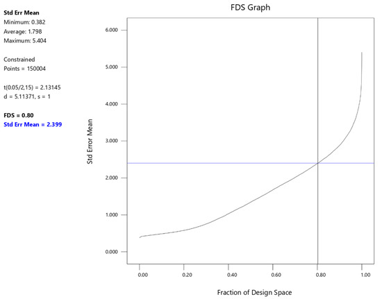 The custom quadratic × linear model in which the terms A, B, C, and D, and interactions: AB, AC, AD, AG, BC, BD, BG, CD, CG, and DG, were evaluated by FDS statistics found that 80% of the design space was below a standard error mean of 2.399.