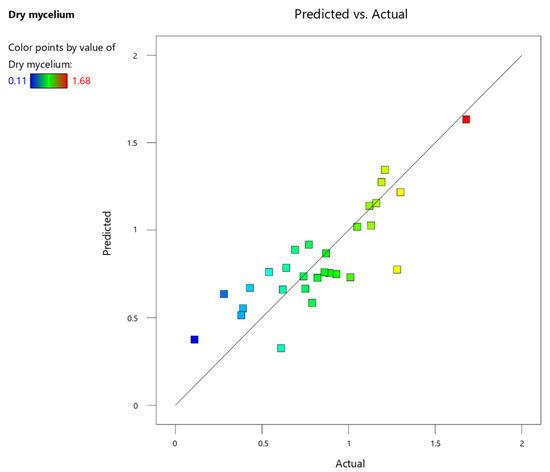 The predicted against actual results of dry mycelium weight (g/500 mL).