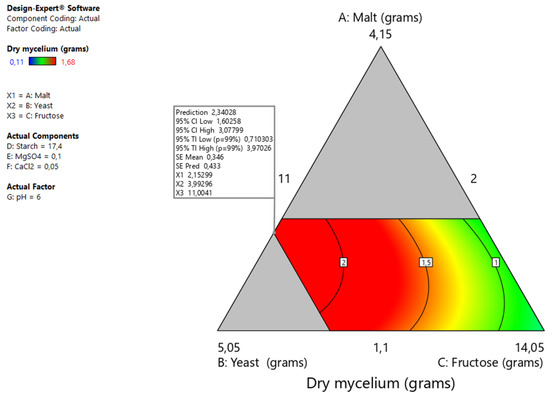 If the interactions related to the G term were not evaluated, the standard error mean for the same fraction of design space became 0.489. However, this approach hinders the significance of the model’s prediction power when evaluating the experimental response. Because the values of the single numeric factor were not generated algorithmically but were inputted based on real data, their predictive power is low. As such, the optimization results relating to the effect of pH on the dry weight of mycelium were not considered.