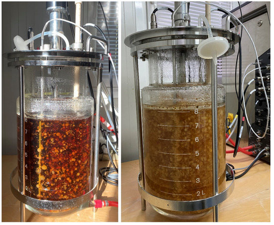 All bioreactor batches were loaded with 8 L of nutrient broth, 6 L of which were sterilized in 2 L communicating vessels, while 2 L remained in the culture vessel. The communicating vessels were sterilized separately from the bioreactor, although for the same duration of time. This procedure allows for better sterilization efficiency, especially when dealing with custom nutrient broths with ingredients having a high microbial load. Sterilization time differed: for potato dextrose broth, we used 20 min at 121 °C; for the custom nutrient broth, we used 50 min at the same temperature.