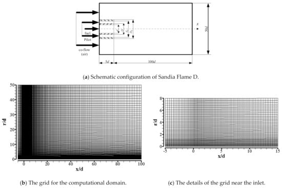 This flame was predicted by means of 2D steady RANS. The settings of the solver in all the simulations included a SIMPLE scheme for the pressure–velocity coupling, Green–Gauss based for the gradient, Presto! for the pressure, and second order upwind for the others. The thermodynamic models used in this work for EDCs were from GRI Mech, and the model for PDF was from the Fluent package. The computational domain extended from 5d behind the nozzle exit plane to 100d in the axial direction and 50d in the radial direction, where d stands for the main jet diameter. The 2D RANS simulations were carried out on a structured grid with an increased resolution close to the nozzle and the symmetry axis. The jet velocity at the nozzle exit was approximated by including the nozzle with length of 5d in the computational domain and axial velocity setting at the inflow boundary using the velocity profiles measured at the nozzle exit plane. The CFD simulations of Flame D were conducted on an axisymmetric numerical mesh. Though not shown in Figure 1, the following four meshes were used for comparison: A: ; B: ; C: ; and D: . All the meshes gave very close results, and either could be used to produce a grid-independent solution. However, the finer mesh (mesh C, shown in Figure 1) with finer grids in the areas of the jet and the pilot was selected and used in all the simulations even though other grids could be used for this 2D steady work. Considering the model selections were for the engineering methane–air combustion, a much finer mesh was unnecessary.
