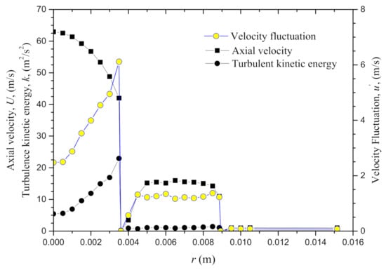 The burner geometry data and boundary conditions used for the simulations are shown in Table 1. It should be noted that the jet velocity, co-flow velocity, pilot velocity, and temperature in the experiment were in a range [42]. For example, the jet bulk velocity, the pilot bulk velocity, and the air co-flow velocity in the experiment were 49.6 2, 11.4 0.5, and 0.6 0.05 m/s, respectively, and these data for the velocity inputs were averaged as 49.7, 12.3, and 0.8 m/s, respectively, from the profiles. The pilot temperature in the experiment was 1880 50 K, while the setting was 1880 K. The profiles for the jet, pilot, and co-flow with the average values, shown in Table 1, were used in the simulation, and these settings, of course, induced different predictions with the experiments. The profiles for the boundary conditions of the average velocity and its fluctuations [42,43], as well as the turbulent kinetic energy [43], are shown in Figure 2. The turbulent dissipation rate ε and the specific dissipation rate used for the turbulence models could be estimated from the average and the fluctuations.