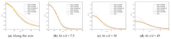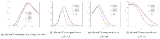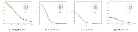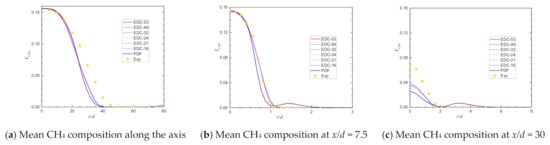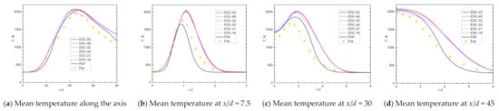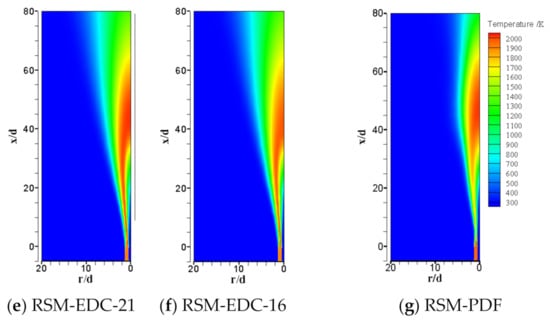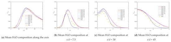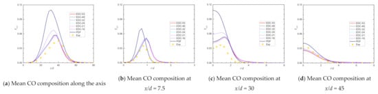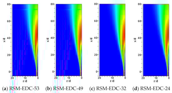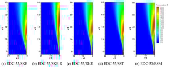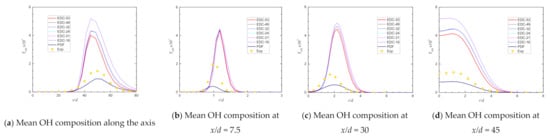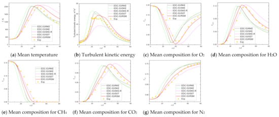 Generally, a reasonable qualitative prediction of the flame was achieved for all model combinations, especially the axial temperature profiles. However, in contrast to those results from LES simulations [15,33,34,35,37,38], none of them came quantitatively close to the measured data. All the axial temperature profiles by the EDCs shown in Figure 7a agreed very well with the experiment data before the axial location of ~x/d = 20, and the others were a little over-predicted.