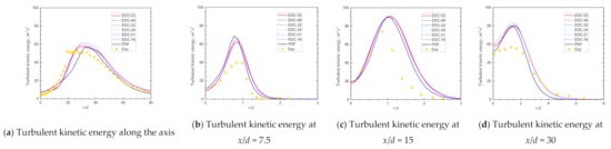 Turbulent kinetic energies along the axis and along the radius @x/d = 7.5, 15, or 30 are shown and compared with the experiments in Figure 8 for the Sandia Flame D with different reaction treatments of the methane–air combustion simulation. All the predictions of the turbulent kinetic energies from the seven cases were a little over-predicted, especially the peaks. Once again, all the predictions by the EDCs agreed very well with each other. The axial profile of the turbulent kinetic energy by the PDF model was found to agree well with the experiments downstream the temperature peak at x/d~45. Generally, a better agreement with the experiments was reached by the PDF model among the seven cases.