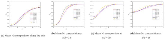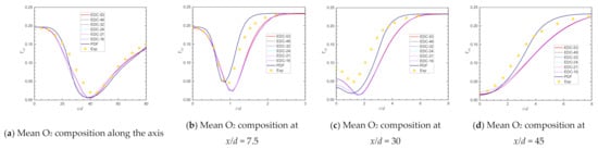 The predicted composition profiles of the reactant mass fractions of CH4 and O2, shown in Figure 10 and Figure 11, were lower than the experiments and those of the product mass fractions of H2O and CO2 were larger (as shown in Figure 12 and Figure 13), indicating that combustion progressed faster than that in the experiment. The CH4 composition profiles from the PDF model, shown in Figure 10, suggested a small amount of CH4 re-formation close to the axis. Due to the over-predicted mixing and diffusion of the jets, the data close to the axis were smaller than those of the experiments shown in Figure 10c. The formation of H2O by the EDCs was earlier than in the experiments, as shown in Figure 12a with quantitative agreement and a little over-predicted peak. Almost all the radial predictions of H2O were larger than the experiments at x/d = 30, as shown in Figure 12c, meaning that the combustion was intensive at this place with a very similar shape of the temperature, as shown in Figure 7c. Other major composition profiles had similar distributions of the composition of H2O, as shown in Figure 11 for O2 and Figure 13 for CO2. The inert N2 composition profiles, shown in Figure 14, agreed quantitatively well with the experiments. Once again, all the N2 predictions by the EDCs agreed very well with each other, and the best results were from the PDF model. The differences between simulations and measured data were not significant for the temperature, the main species (such as H2O, O2, N2, and CO2), and the mean velocities. The behavior of these species had the same trend as that for the temperature. The profiles of the values for composition along the axis and the radius replicated the behavior of the temperature.