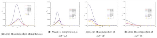 Mean axial velocity profiles along the axis and along the radius @x/d = 7.5, 30, or 45 are shown and compared with experiments in Figure 9 for the Sandia Flame D with different reaction mechanisms. Reasonable qualitative predictions were reached for the mean axial velocity profiles from the seven cases, while the predictions by the PDF model were a little under-predicted. Very small differences of mean axial velocity profiles, shown in Figure 9, were found from the predictions by the EDCs. The largest deviations were found downstream of the jet, as shown in Figure 9a,b close to the axis. This means the mixing between the jet and the pilot flows was over-predicted compared with the experiments, leading to the jet diffusing faster in this large temperature difference case.