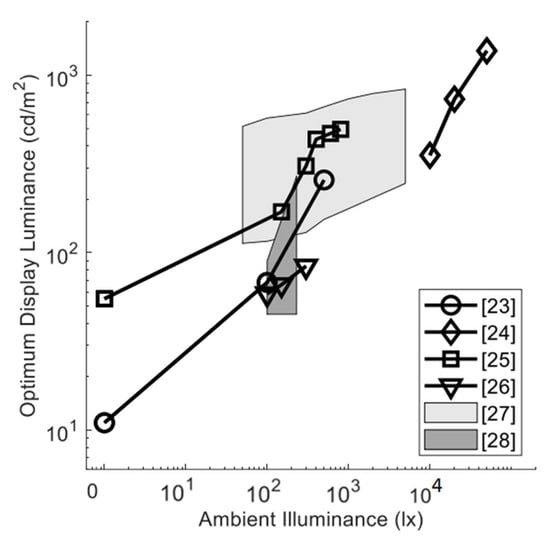 Ambient illuminance and screen luminance are frequently examined separately in different studies, and only a few investigations have studied the impact of ambient illuminance and screen luminance levels on visual fatigue and visual performance. For example, Benedetto et al. (2014) explored the combined effects of these two factors on visual fatigue and performance by manipulating the ambient illuminance (5 and 85 lx) and screen luminance (20 and 140 cd/m2) simultaneously between subjects. They found that although subjective visual fatigue was not affected by either screen luminance or ambient illuminance, objective visual fatigue evaluated by blink frequency increased under high luminance conditions (140 cd/m2) [22]. Using limited levels of ambient illuminance and screen luminance, this line of research provides a relatively better solution for visual fatigue. However, with regard to practical settings, the levels of illuminance and luminance employed would vary significantly, and some levels may be easily neglected by this line of research. To solve this problem, multiple levels of illuminance and/or screen luminance, with a wide range, need to be manipulated to determine the optimal screen luminance under different ambient illuminances. The related studies are summarized in Figure 1. Li et al. (2013) investigated the optimum screen luminance of mobile phones (Samsung S5660, 3.2 inch TFT-LCD screen, 480×320 pixels) under ambient illuminance by measuring task performance, CFF and subjective ratings of comfort, visual fatigue and overall satisfaction. The results of these studies showed that optimum screen luminance under ambient illuminance levels of 0, 100 and 500 lx corresponded to 11, 68 and 257 cd/m2, respectively [23]. Using the same mobile phone, Zhang et al. (2013) revealed that optimum screen luminance levels under outdoor illuminance levels of 10k, 20k and 50k lx were 354, 734 and 1375 cd/m2, respectively [24]. In a study by Ye et al. (2014), participants were required to evaluate the display quality and visual fatigue associated with three different mobile phones (Samsung Galaxy S3, Nokia 920 and iPhone 4S) to investigate the optimal luminance under variable levels of ambient illuminance. They found that the optimal luminance levels for 0, 150, 300, 400, 600 and 800 lx were 55, 170, 308, 436, 470 and 496 cd/m2, respectively [25]. Yu et al. (2018) found that the optimal luminance for short-term reading was 58.5, 66, and 84 cd/m2 for 100, 150, and 300 lx, respectively [26]. Recently, Kim et al. (2017) identified the comfort zone of display luminance under different ambient illuminances [27]. In a follow-up study, Yu et al. extended the reading duration and found that the optimal luminance zones were 45–90 cd/m2 under 100 lx and 45–270 cd/m2 under 230 lx [28]. These findings indicated that optimum screen luminance increased with increasing ambient illuminance, which was in accordance with Weber–Fechner’s Law of brightness perception [29,30]. More specifically, brightness perception, an attribute of visual perception in which a source appears to be radiating or reflecting light, depends on the relative weight between screen luminance and ambient illuminance. It is essential to increase the screen illuminance accordingly with the incensement of ambient illuminance to keep the brightness perception unchanged.