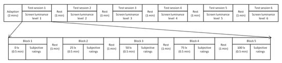 Following previous studies [27,42], the ambient illuminance increased sequentially from block 1 (0 lx) to block 5 (100 lx) because the speed of light adaptation is much faster than that of the dark adaptation in the human visual system [52], and the screen luminance was set randomly at one of six luminance levels for each session. In each measurement block, ambient illuminance lasted for 30 s, and the participants were asked to read the randomized presented novel on the computer screen. After each screen luminance and ambient illuminance combination, they were asked to evaluate screen brightness, visual comfort with screen luminance, satisfaction with ambient illuminance, and visual fatigue with questionnaires. The screen luminance and ambient illuminance remained unchanged until they finish all ratings during each measurement block. Between the two blocks, the participants had 1 min to rest, during which the participants were requested to close their eyes while the experimenters manipulated the ambient illuminance level. The order of the screen luminance was randomized between blocks. There was also 1 min between the sessions for participants to close their eyes to rest and for the experimenters to change the screen luminance. Multiple short breaks between blocks and test sessions were also used to relieve the potential stress imposed on the participants. An overview of the experimental procedure is shown in Figure 3, and the formal experiment lasted for approximately 76 min in total.