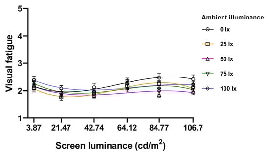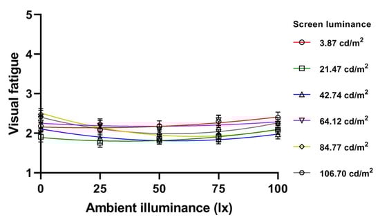 The descriptive data for visual fatigue are shown in Table 5. Participants’ visual fatigue was lowest at a screen luminance between 21 and 42 cd/m2 and at an ambient illuminance between 25 and 50 lx.