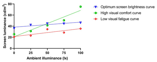The optimum screen brightness curve, high visual comfort curve and low visual fatigue curve for screen luminance under different ambient illuminance conditions are shown in Figure 7. The screen luminance levels for optimum screen brightness, high visual comfort and low visual fatigue all increased with increasing ambient illuminance levels. Regardless of the ambient illuminance level, the low visual fatigue curve was always below the two other curves. When the ambient illuminance changed from 0 lx to 100 lx, 20.63–75.15 cd/m2 was the best range for screen luminance with respect to screen brightness, visual comfort and visual fatigue.