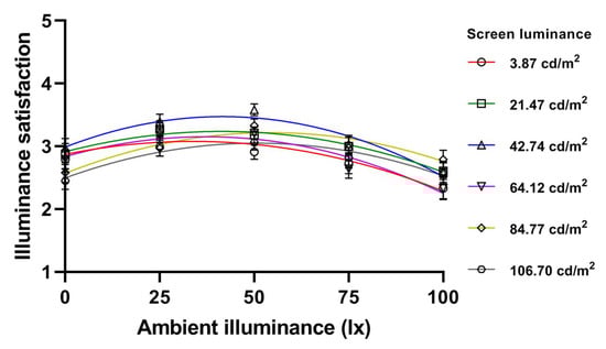 The descriptive data for illuminance satisfaction are shown in Table 4. The current findings showed that participants’ satisfaction with ambient illuminance was greatest at a screen luminance of approximately 42.74 cd/m2 and ambient luminance between 25 and 50 lx.