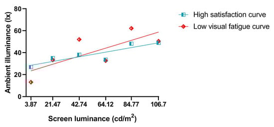 The high satisfaction curve and low visual fatigue curve for ambient illuminance with different screen luminance conditions are presented in Figure 10. These results showed that the optimum ambient illuminance, in terms of satisfaction and visual fatigue, increased with increasing screen luminance. When the screen luminance changed from 3.87 cd/m2 to 106.7 cd/m2, the optimum ambient illuminance ranged from 13.08 lx to 62.16 lx.