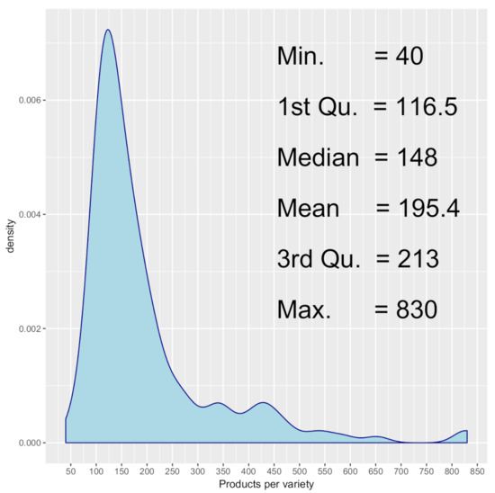 Table 1 also includes the number of different values that exist in the variable considered MDD-DS. Thus, as a categorical variable, the dataset shows 159 levels for Variety. The fact of knowing in which upper level of categorization is each variety can be helpful for classification purposes. Brand can bring useful information apart from the Name and Legal Name since they are defining the kind of product. Regarding Ingredients, it is a list of ingredients that require further processing in order to support the classification. Figure 1 shows the distribution of products per variety as well as the statistical parameters of this distribution. The average number of products per variety is around 200, being the 1st quartile , so that 75% of the varieties have a number of assigned products above 213 products.