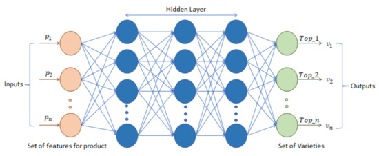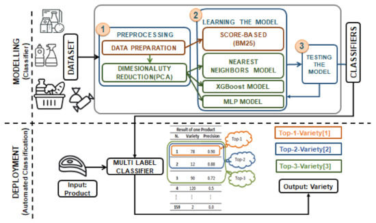 In order to automatize the time-consuming classification process, this paper proposed a multi-label classification methodology to map inputs (new products) to a maximum of three labels from all the varieties considered (The number of varieties is a restriction of the dataset). According to the scheme in Figure 2, the deployment of our solution (bottom part of the figure) takes Name, Legal Name, and Ingredients of a new product () as input observational variables. Then, a multi-label classifier predicts the varieties’ score of that is the classification score for to be a member of each variety (class) in the taxonomy. The output is defined as the three varieties with higher scores. From these three varieties, the sets ; and are defined. This paper describes the methodology and experiments to obtain the classifiers by using the MDD-DS (described in Section 3). The modeling methodology consists of three main steps: (1) preprocessing the data and potentially reducing their dimensionality; (2) learning the classifier model: four different classifier models, such as score-based model, nearest-neighbors models (KNN: K-Nearest Neighbors and FKNN: Fuzzy K-Nearest Neighbors), XGBoost model and deep learning (MLP or Multi-Layer Perceptron Network); (3) testing the classifier models in order to compare them and estimate the quality measures of our approach. In step (1), and in order to apply machine learning and deep learning approaches, we include a new sub-step for dimensionality reduction based on PCA (Principal Component Analysis).