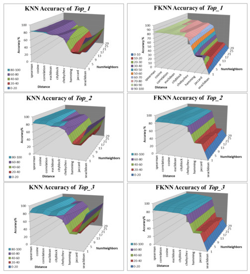 The key to success in KNN and FKNN are finding the optimal value of k and the distance function. Usually, the k parameter is chosen empirically depending on each problem, different numbers of nearest neighbors are tested, and the parameter with the best performance (accuracy) is chosen to define the classifier. Choosing the optimal k is almost impossible for a variety of problems since the performance of a KNN classifier varies significantly when changing k and the change of the distance metric used [49].