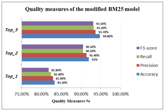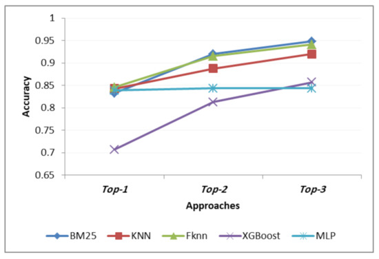 To sum up, Figure 8 shows the comparison in terms of accuracy among all the models (for their optimal values) regarding , and . The best in is FKNN followed by KNN. In addition, the appropriate one in , is BM25 followed by FKNN.