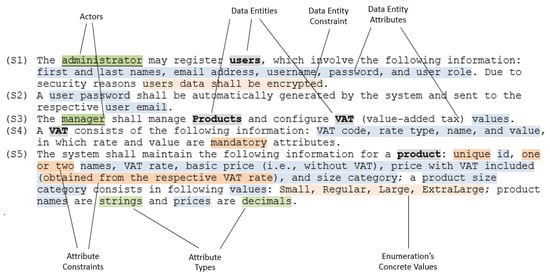 Example of informal requirements with data entities and other related elements.