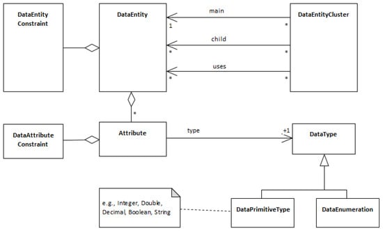 Figure 2 shows the RSL partial metamodel that involves the constructs discussed in this paper. For example, it shows that: (1) a DataEntity aggregates a set of Attributes, which are classified as a primitive type or a data enumeration; (2) data constraints can be assigned to DataEntities or Attributes; (3) DataEntityCluster defines a set of inter-related data entities, each one with a predefined role such as main, child, or uses roles (further details on these concepts in Section 4).