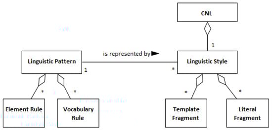 Furthermore, as suggested in Figure 3, a linguistic pattern can be represented in multiple manners depending on the needs and interests of its users. In this context, a linguistic style is a concrete representation of a linguistic pattern, which means that a linguistic style is a specific template to which attributes of the linguistic pattern can be substituted. Thus, a linguistic pattern can be represented by multiple linguistic styles, such as RSL, CNL-A, CNL-B, and others.