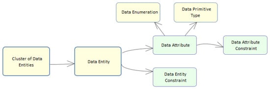 As illustrated in the mind map of Figure 4, this suggests the existence and relationship of the following concepts: data entity, data attribute, data entity constraint, data attribute constraint, cluster of data entities, data enumeration, and data primitive type. Often these concepts appear in many specifications but scattered throughout the text and inconsistently with different names or different writing styles, as briefly introduced above in Section 1 and depicted in Figure 1. In this section, we argue that for all these concepts, there are patterns that might have diverse but consistent representations.