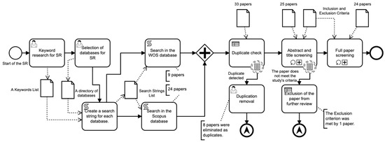 For data collection, an advanced search in the WOS and Scopus databases was used. For each search string, the appropriate number of search queries were compiled. The documents were then examined to see if they did not meet the EC1 criterion and but did meet the IC1–IC3 Criteria, using the Kitchenham [34] procedure and the Preferred Reporting Items for Systematic Controls and Meta-Analyses (PRISMA) [35].