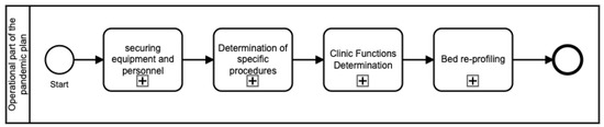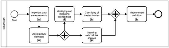 In the first step, vital information about healthcare providers must be gathered. Subsequently, the activity that the given subject (hospital) would perform in the event of a pandemic is defined. Moreover, as with the trauma plan, all possible external sources of risks and threats that could lead to mass health damage must be identified with the assistance of the Fire and Rescue Service. Even here, all internal risks that could jeopardize the hospital’s operation in a crisis like a pandemic were identified. The provider must also characterize all types of different injuries and illnesses for which a given pandemic plan is compiled, as well as define the measures that must be implemented when fulfilling a pandemic plan. This step will be carried out based on both external and internal risk analysis, as well as the disabilities for which the pandemic plan is intended. Figure 4 represents the corresponding diagram of the primary part model.