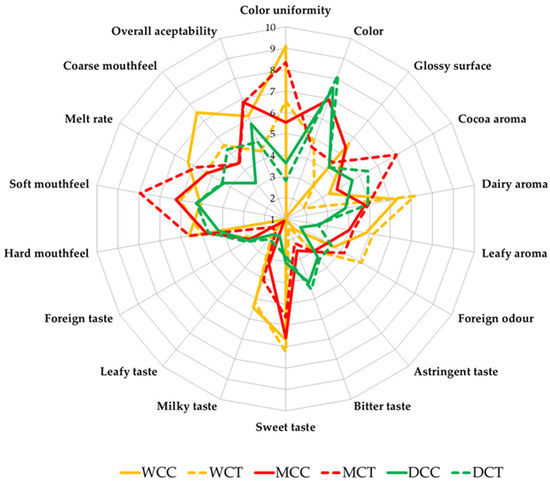 Radar chart with average consumer assessment results obtained by scaling method for white, milk and bitter chocolates with the addition of yellow tea extract (0.2%); WCC—white chocolate control; WCT—white chocolate with tea; MCC—milk chocolate control; MCT—milk chocolate with tea; DCC—dark chocolate control; DCT—dark chocolate with tea.