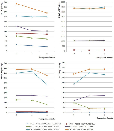 The samples of chocolate with an addition of yellow tea extract were tested for antioxidant activity in free radical tests (DPPH• and ABTS•+) and ORAC test during 6 months of storage at ambient temperature. The obtained results are presented in Figure 4. DPPH• and ABTS•+ as stable radicals are widely used to evaluate the antioxidant activity of various compounds and thus acting as antioxidants [62]. All analyzed samples showed higher activity in DPPH radical scavenging compared to ABTS assay. The highest activity toward radical, measured in Trolox (Tx) equivalents, was found in samples of dark chocolates, which were found to differ significantly between other samples (p < 0.05).
