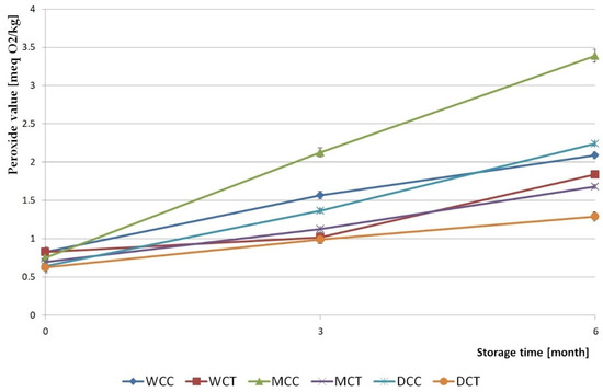 Peroxide value of white, milk and dark chocolate extracts with 0.2% addition of yellow tea extract during storage; WCC—white chocolate control; WCT—white chocolate with tea; MCC—milk chocolate control; MCT—milk chocolate with tea; DCC—dark chocolate control; DCT—dark chocolate with tea.