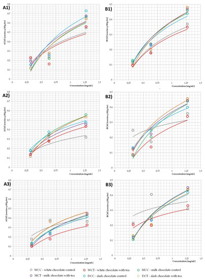 The confectionery products, different chocolates with yellow tea extract, were characterized in terms of their capacity to inhibit the activity of cholinoesterases (ChEs), i.e., acetylocholinoesterase (AChE) and butyrylcholinoesterase (BChE) (Figure 6). The inhibition capacity of chocolates with and without addition of yellow tea extract was expressed as eserine equivalents per 1 g of product. Results showed that all chocolates exhibited cholinesterases inhibition capacity in a concentration-dependent manner. Confectionery products inhibited AChE to a greater extent than BChE. In the initial stage of storage, it was dark chocolate without addition and milk chocolate with yellow tea that inhibited AChE to the greatest extent, while white chocolate with and without addition to the lowest degree. Total capacity to inhibit AChE differed depending on the type of chocolate and was as follows: WCT = WCC < MCT = DCT = MCC < DCC. However, the 6-month storage influenced the AChE inhibitory capacity for dark and milk chocolate, both with yellow tea. The lowest activity was found for white chocolate with the addition of yellow tea. After the end of storage, total capacity to inhibit AChE was as follows: WCT < MCT = DCC = MCC < WCC < DCT.