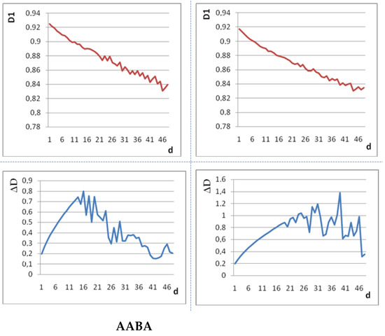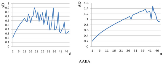 The deterministic function of the information system of the image of the control sample microstructures has the relative randomness S = 0.55 − 0.69 and the relative organization R = 0.31 − 0.45. One can note the value of 70% of the renewal of active elements of the microstructure in the spectrum of levels of the dynamic state of microstructures of the AB and BB cells. The entropy of the equilibrium levels of the AB and BB cells is D1eq = 0.87534 and D1eq = 0.8805, respectively. For the BA cell (Table 1), the update is 50%, and the structural entropies of the static and dynamic states are close in magnitude. The invariant variety is observed in the change ∆D (Figure 3) in the form of increasing the resonant maxima in a wide range of changes in the scale of d. The relative organization of the functional state of the information system of the BA microstructure is R = 0.31. The structural entropy of the static state exceeds the entropy of the dynamic state in the information system of the AA microstructure, so the information capacity of K = exp(H) = 4.7 × 105 is higher than the capacity of K* = exp(H*) = 3.4 × 104.