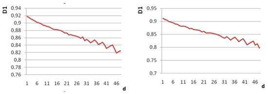 It should be noted that the modification of cement composite increases the thermodynamic fluctuations of chemical and phase compositions, affectsthe parameters of Ks orderliness and the entropy of D1 in the information system of microstructure, and leads to disorder both of the scale invariance and the monotony of dependencies. The break points of the dependencies correspond to non-equilibrium phase transitions. The modification is accompanied by the increase of the orderliness of Ks × 10−3 and the decrease of the information entropy in spectrum of dynamic deterministic state of the composition, with the additive due to the processes of dynamic self-organization in the course of information transformations. The processes of thermodynamic self-organization are observed as non-equilibrium phase transitions in the form of violations of scale invariance in Figure 5 and Figure 6 at the d scale up to 45 pixels.