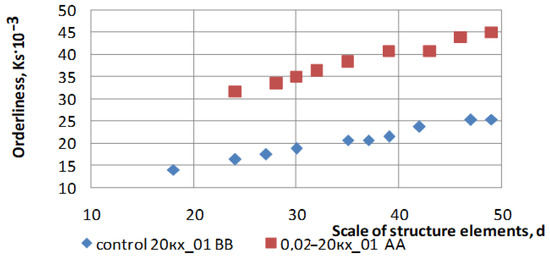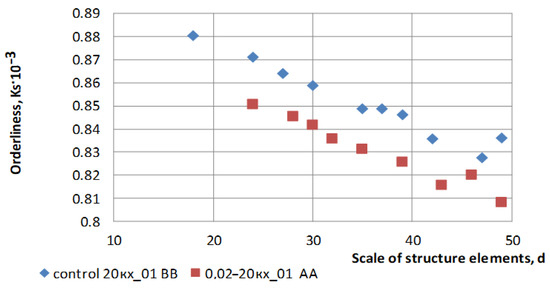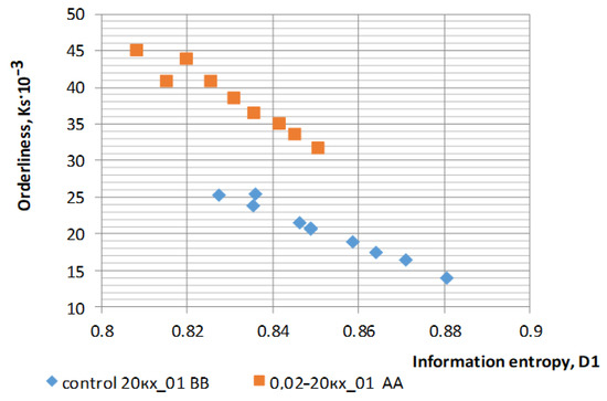 The spectrum of information-entropy levels of dynamic deterministic states of the information systems of the control sample for the BB section and the modified sample for the AA section areshown in Figure 4. The influence of the scale on the changes in the information entropy of D1 and the ordering of KS × 10−3 in the spectrum of levels of dynamic state of the information system of the modified and control microstructures are analyzed in Figure 5, Figure 6 and Figure 7.