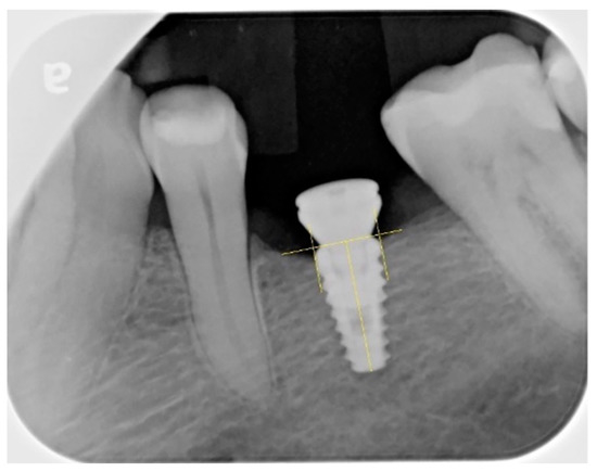 Radiographic image showing the procedure for marginal bone level (MBL) measurement.