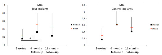 As second level analyses, the temporal evolution of MBL values for test and control implants was statistically evaluated separately. The Friedman nonparametric statistic for correlated samples showed significant differences in MBL values for baseline, 6-month and 12-month follow-ups in test implants (p = 0.004) (Figure 3). Post-hoc analysis showed a significant difference between MBL values at baseline and at 6-month follow-up (p = 0.006). The same trend was found in the control implants, but the difference was not considered statistically significant (p = 0.067).