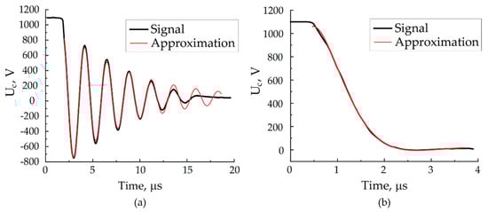 Here and next, U c stands for the voltage amplitude, t for time, γ = R e ( 2 L ) 1 for the damping coefficient, ω 0 = ( L C ) 0.5 for the natural frequency of harmonic oscillations, R e = R + R s for the total equivalent electrical resistance of the discharge circuit, represented as the sum of the equivalent electrical resistances of the discharge circuit R and of the spark gap R s , and L and C for circuit inductance and capacitance, respectively.