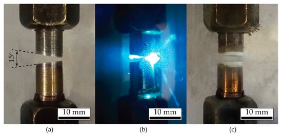 Figure 3. Photos of the gap between the electrodes with end faces forming the angle of 15°: (a) before the start of the SD process, (b) during the discharge process and (c) 6 h after the spark treatment by the ODP.