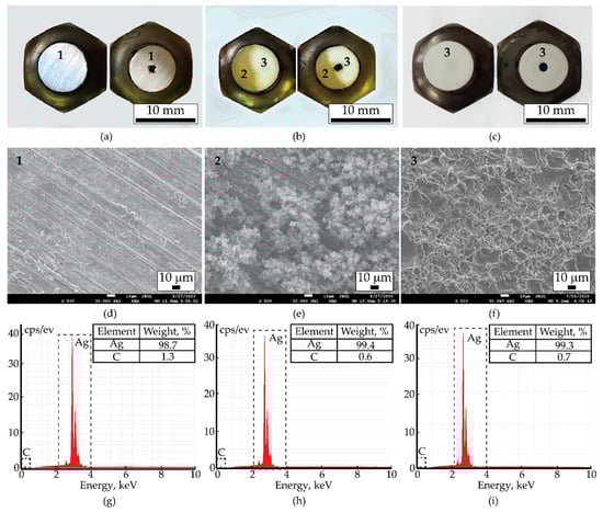 The SEM image of area 1 of Figure 4a shows a typical surface of the original polished electrode, characterized by an average roughness of Ra = 0.5 µm. On the electrodes’ end faces, initially located at the angle of 15° (Figure 4b), after processing with the SD, two typical areas marked in the Figure 4b with the numbers 2 and 3 are observed. As it can be seen from the SEM image of the area 2, the polished surface of the electrode is covered with a loose layer of dendrite-like NP agglomerates. Presumably, the main part of such agglomerates was formed with electrical erosion and transferred from the opposite electrode. Area 3 represents exactly the electrode surface treated with the SD, and as it can be seen from the SEM image, it consists of overlapping craters with dimensions of about 10 µm. Each subsequent discharge, leading to the formation of a new crater, can occur in places of increased electric field density on microprotrusions formed over the previous crater edge as a result of spilling molten metal. The elemental composition of Ag electrode surfaces, according to the results of EDX (Figure 4g–i), dominantly consist of silver for all cases, presented in Figure 4a–c. In this case, the presence of carbon may be associated with the presence of carbon-containing compounds in the carrier gas and adsorbed substances in the gas discharge chamber and on the initial electrodes.