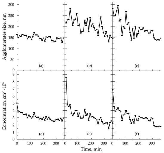 Figure 10. Time dependences of the modal size of NP agglomerates and their concentrations during the electrodes wear by the UDP for electrodes ends arranged (a,d) in parallel and at the angles of (b,e) 3° and (c,f) 10°.