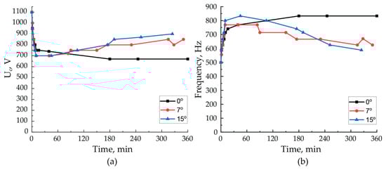 Figure 6. The dependences of (a) the capacitor charging voltage and (b) frequency of the capacitor discharges for the case of synthesis with the ODP for electrodes’ ends located parallel and at angles of 7° and 15°.