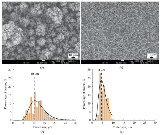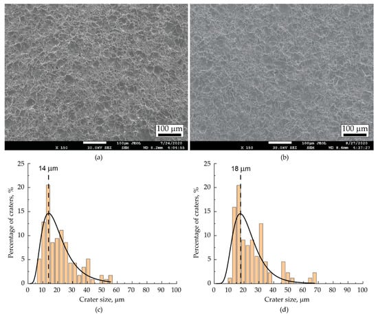 It is also of interest to compare characteristic dimensions of craters formed by the SD on surfaces of electrodes initially installed parallel and at the angle 15° (Figure 7a,b). SEM images of the electrode surfaces being under erosion for 2 h were analyzed. The analysis was carried out only for the upper craters with a closed outer border in the form of a breastwork. As it can be seen from the comparison of the crater size distributions (Figure 7c,d), in the case of the initial parallel arrangement of electrodes end faces, the size of craters is noticeably smaller than when the electrodes end faces are located at an angle. This effect is logically explained by a smaller equivalent working area of electrodes’ initially installed at an angle, and, as a result, a higher average discharge current density. At the same time, the craters’ average diameter is less than 20 μm in both cases, corresponding to experimental observations in previously performed works of other authors [34,35,36].
